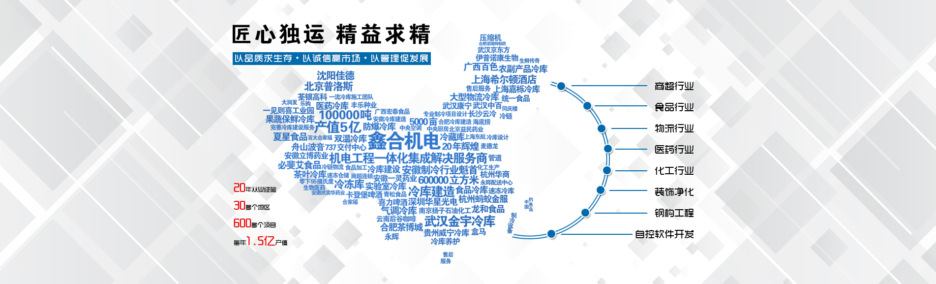 冷凍冷藏設備大型冷庫項目:   武漢中百物流冷庫(40000㎡)、蘇州、北京普洛斯大型物流庫(17000㎡)、沈陽佳德物流冷庫(20000㎡)、上海東航配餐物流庫(6000㎡)、杭州華商勾莊物流冷庫(24000㎡)、安徽安心蔬菜綠色食品冷庫(12000㎡)、武漢金宇冷庫(35000㎡)、必斐艾食品廠(14000㎡)、中國-東盟(百色)農產品交易中心冷庫物流工程(30000㎡)、遵鐵物流冷鏈物流區建設項目中心冷庫物流工程(16500㎡)、長沙云冷產業園冷庫物流工程(21000㎡)等;大型中央空調項目:   武漢康寧顯示玻璃廠廠房、武漢京東方模組廠房、武漢華星光電模組廠房、深圳華星光電模組廠房,杭州阿里巴巴辦公樓,舟山波音737機場辦公樓,南京江北能源站、上海金融大酒店等